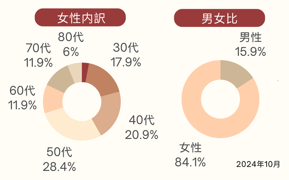 また、30代から50代の女性だけで全来院者数の65%以上を占める、大人の女性のための整体院です。